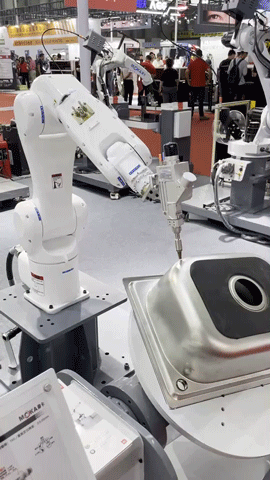 此焊接工作站搭載江龍智能的梟隆焊機,雙電機同步驅動,具有推拉絲、送絲功能,適用于焊接碳鋼、不銹鋼、鋁合金、直流、單脈沖、雙脈沖?,F場為用戶們展示焊接實操,吸引不少國內外客戶駐足觀看。